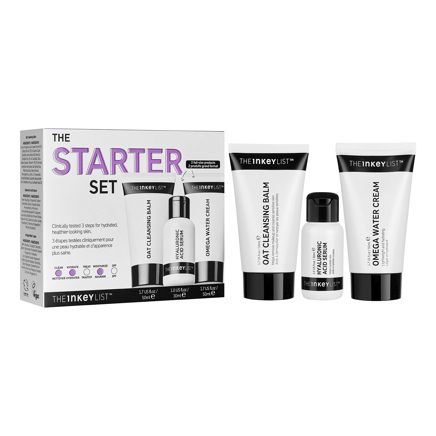 Neu hier? Hier kommt die ultimative Vorstellung von The INKEY List. Das Starter Set wurde mit fundiertem Fachwissen und mit Unterstützung der Wissenschaft entwickelt und setzt sich zusammen aus drei heldenhaften klinisch getesteten Pflegeprodukten für eine mit Feuchtigkeit versorgte und gesünder wirkende Haut. Diese Produkte stellen den Ausgangspunkt deiner wirksamsten Hautpflegeroutine dar. Ideal für alle, egal wie dein Weg in der Hautpflege bisher aussah. REINIGUNG: Reinigungsbalsam mit Hafer Dieser tiefenwirksam nährende Reiniger, der die obere Hautschicht nicht abträgt, lässt das Make-up in einem einzigen Schritt schmelzen. Der milde und reichhaltige Balsam mit 3% Hafersamenöl dringt in die Haut ein, um sie tiefenwirksam zu reinigen und mit Feuchtigkeit zu versorgen, wobei er die letzten Schminkreste (darunter auch wasserfestes Make-up) mühelos, doch auf eine sehr wirksame Art und Weise beseitigt. FEUCHTIGKEITSPFLEGE: Das Serum mit Hyaluronsäure Steigere die Feuchtigkeit deiner Haut mit unserem ersten Bestseller. Als ein Must-have für den Alltag für alle Hauttypen hat es eine klinisch nachgewiesene Wirkung, der Haut sofortige und anhaltende Feuchtigkeit zuzufügen. Dieses Superserum hat sich für seine nicht fettige und nicht klebrige Textur bewährt und macht die Haut prall, glatt und gesund. FEUCHTIGKEITSPFLEGE: Die ultimative Wassercreme Oméga Diese ölfreie Feuchtigkeitspflege versorgt durstige Haut mit Feuchtigkeit, indem sie sie mit leichter Feuchtigkeit versorgt, um eine pralle und rosige Haut herbeizuzaubern. Die Kombination von Niacinamid, Omega-Fettsäuren und Glycerin stärkt die Haut und trägt dazu bei, überschüssigen Talg zu minimieren, die Sichtbarkeit von Poren zu verbessern und den Teint zu vereinheitlichen.